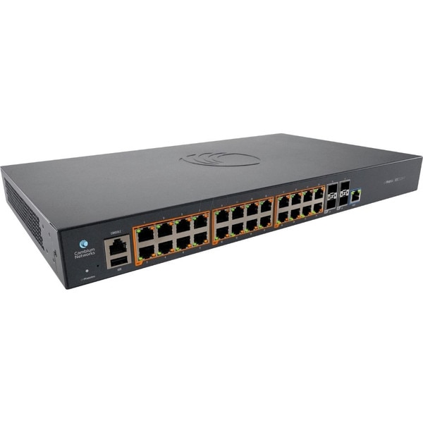 The cnMatrix series of fully managed switches from Cambium delivers full Layer 2 and Layer 3 capabilities with enhanced access security. The CAM-EX2028P offers flexibility with SFP+ (10Gbps) or SFP (1Gbps) uplink ports.