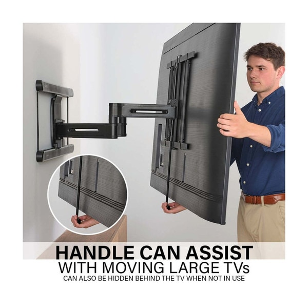 If your TV doesn’t happen to end up in the position you hoped it would be or you accidentally mismeasure during installation, Sanus' shift height adjustment feature allows for easy TV height readjustment, either up or down, ensuring that your TV is perfectly positioned where you want it. This height adjusting feature is easily performed with the simple twist of the handle that can be lowered down from behind the TV for easy access and then placed back behind the TV to remain hidden until next desired use. The shift handle can also assist with moving large TVs with ease. As large TVs may be too big to reach both sides, you can simply grip the handle and use to assist with effortlessly moving the TV into the desired position.