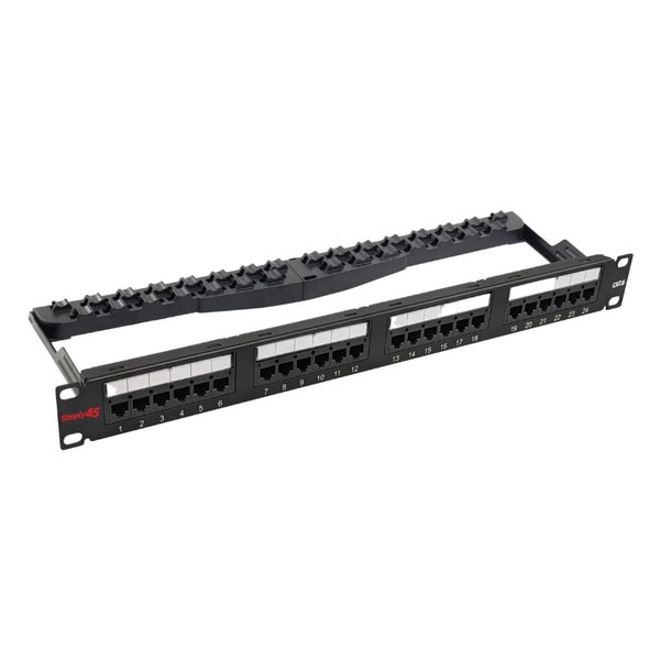 Simply45's S45-2624 CAT6 Rack Mount Patch Panel allows easy installation of a network panel in the field and offers the maximum use of panel space. This 24 port loaded UTP CAT6 patch panel includes a cable management bracket, 24 cable ties and 4 rack screws.