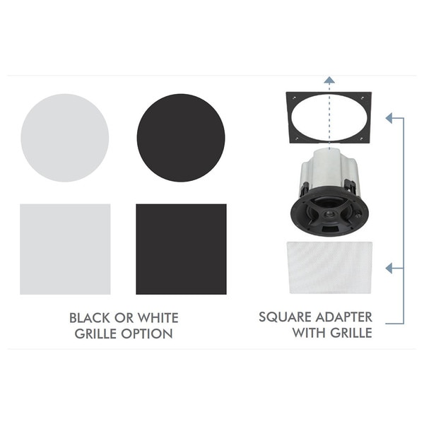 Additionally, the optional square grille adapter allows speakers to match the aesthetic of square downlights and HVAC grilles to achieve continual sight lines and a pleasing aesthetic.