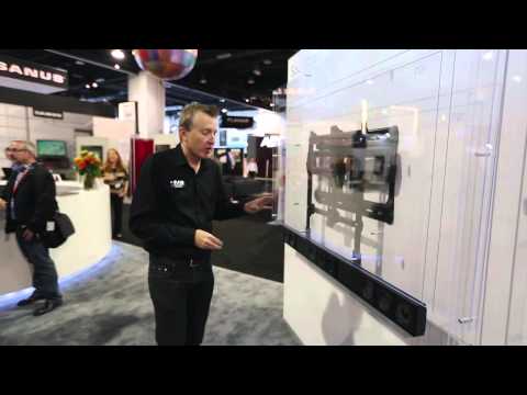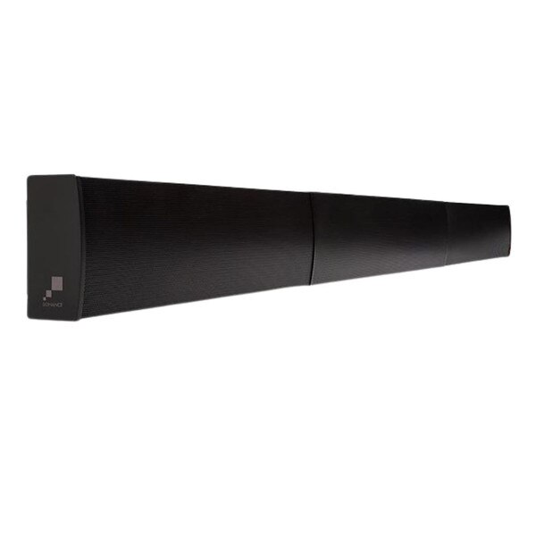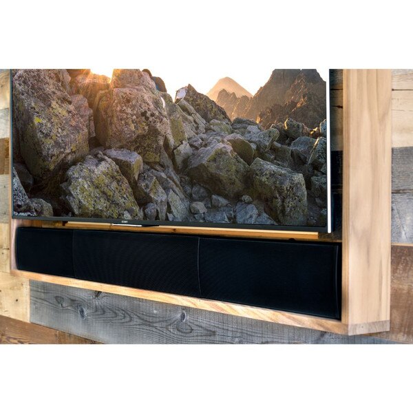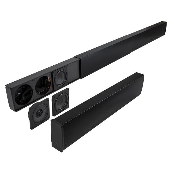 The Sonance SB46L black soundbar features a design that allows the installer to adjust the width to perfectly match any display between 70" to 80".